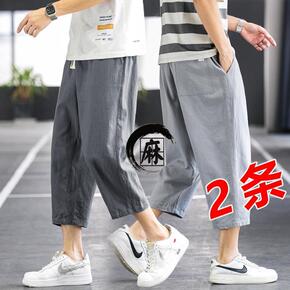 棉麻男裤短裤男夏季薄款潮流宽松休闲运动八分阔腿亚麻...