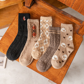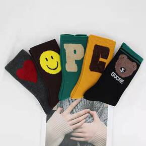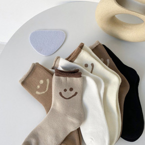 秋冬新款中筒袜in潮日系可爱卡通笑脸卷边加厚棉袜毛...