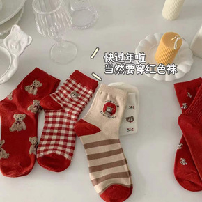 本命年红袜子女士秋冬季大红色中筒袜新年袜长袜潮流圣...