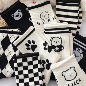 小熊袜子女ins潮流时尚可爱黑白棋盘格中筒袜学生长...