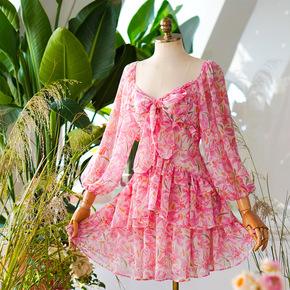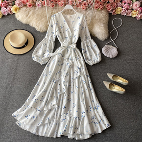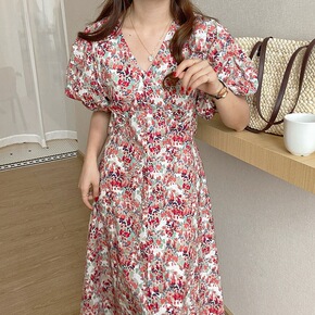 现货直发22夏碎花V领连衣裙收腰泡泡袖初恋一字肩小...
