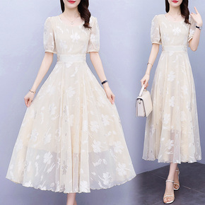 雪纺连衣裙2022年夏季新款气质圆领收腰显瘦中长裙...