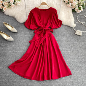 2022夏季名媛气质纯色圆领收腰蝴蝶结系带显瘦灯笼...