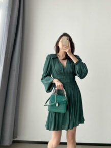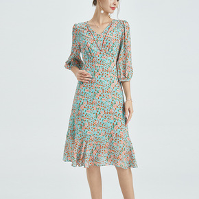 真丝碎花连衣裙2022新款复古气质法式收腰显瘦绿色...