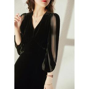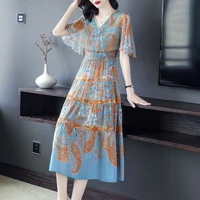夏季新款81316法式优雅风桑蚕丝长裙收腰订珠V领...