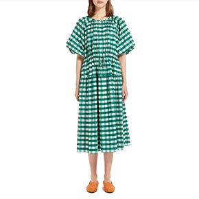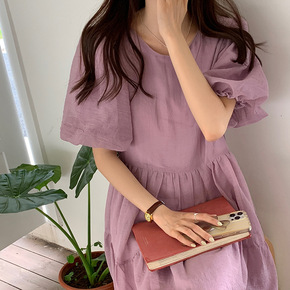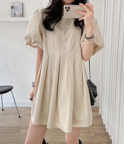 柴渔家夏季简约气质圆领压褶收腰显瘦灯笼袖A字型连衣...
