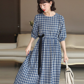 2021夏装新品气质优雅文艺风格纹中长款连衣裙收腰...