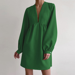 欧洲站2022夏季外贸女装 V领灯笼短袖紫色收腰中...