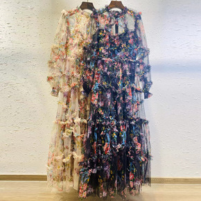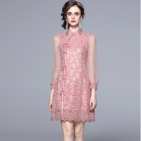 立领提花拼接钉珠网纱袖收腰显瘦改良旗袍连衣裙女20...