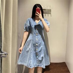 实拍韩国chic女装气质夏季圆领泡泡袖收腰显瘦灯笼...