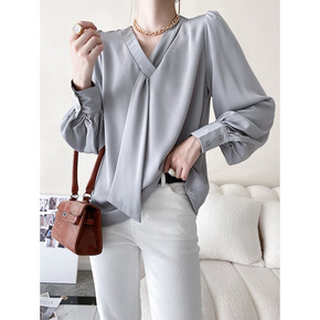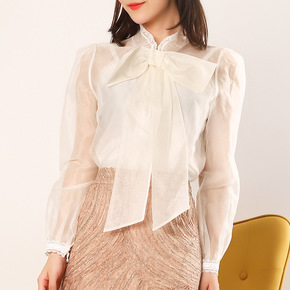 司南 飘带领结V领衬衫女2021秋季新款优雅泡泡袖...