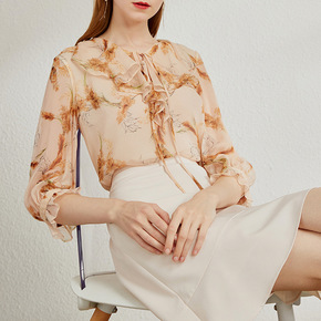真丝长袖衬衫女荷叶边拼接白色飘带上衣小衫秋季桑蚕丝...