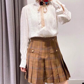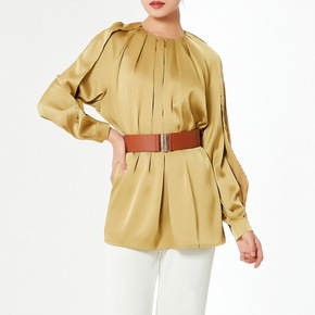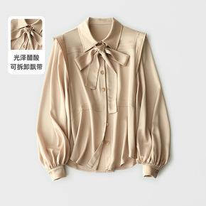 法单2021春夏新款圆领系带衬衫女灯笼袖缎面提花上...