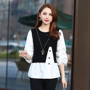 假两件上衣衬衫女韩版春秋2021新款宽松显瘦遮肚子...