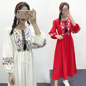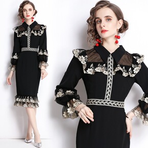 实拍现货 欧美复古刺绣花边装饰灯笼袖修身连衣裙原版...