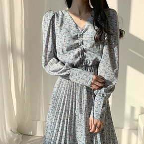 韩国chic优雅温柔碎花V领小心机皱褶收腰显瘦灯笼...