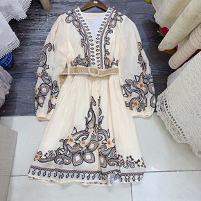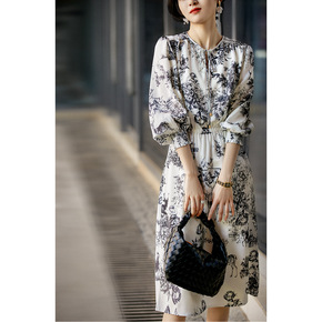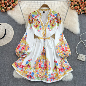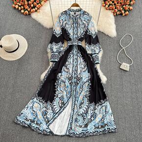 宫廷风复古印花长袖收腰单排扣灯笼袖a字大摆连衣裙优...