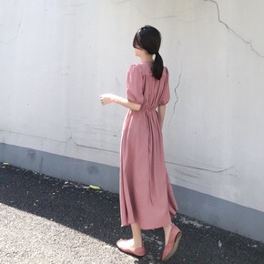 韩国chic秋季法式小清新圆领系带收腰显瘦过膝长款...