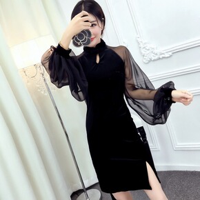 2022春季新款夜店女装性感网纱灯笼长袖金丝绒复古...