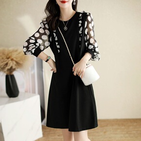 外单2022秋季新品秋装通勤撞色波点雪纺拼接灯笼袖...