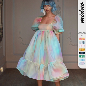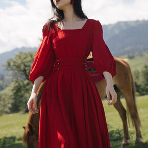 春上新2022新款夏装方领灯笼袖褶皱假两件名媛气质...