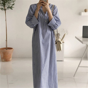 585韩国早秋条纹连衣裙2019秋季九分袖中长款宽...