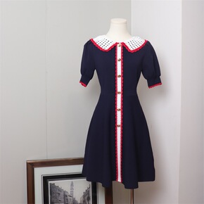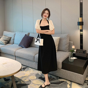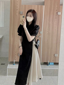 黑色拼接连衣裙女2022新款春夏法式泡泡袖小众设计...