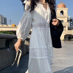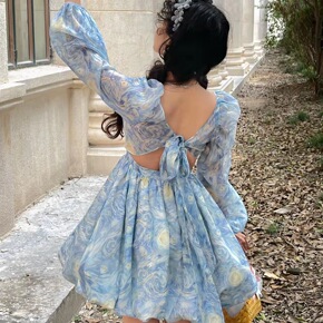 2022法式女装欧美秋冬新款浪漫彩绘印花大摆炸街纯...