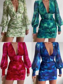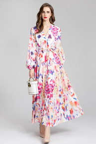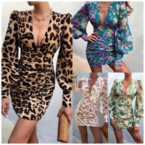 2021新款亚马逊爆款热卖欧美女装雪纺印花V领长袖...