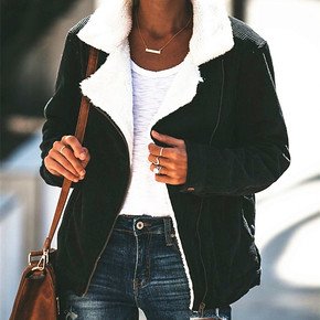 2020欧美秋冬季夹克灯芯绒拼接羊羔毛大翻领斜拉链...