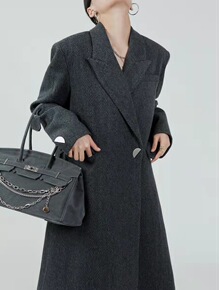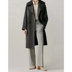 设计师款九分袖灰色双面羊绒大衣西服领羊毛外套...