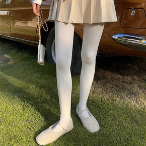 日系复古针织麻花打底裤女秋冬外穿竖条纹燕麦白连裤袜...