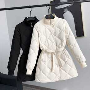 2021冬季新款立领菱格系带收腰显瘦保暖中长款羽绒...