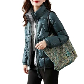 新款羽绒服女欧美短款羽绒服休闲下摆抽绳亮面立领冬季...