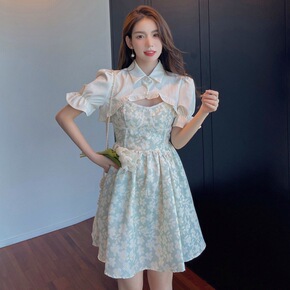 2022夏季新款气质法式木耳边喇叭袖上衣+碎花吊带...