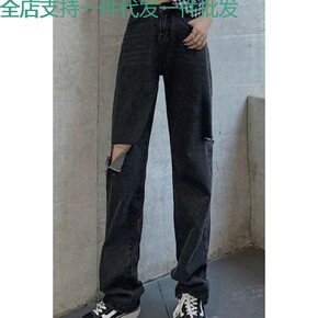 黑色高腰直筒牛仔裤女春夏季女装2022新款小个子显...