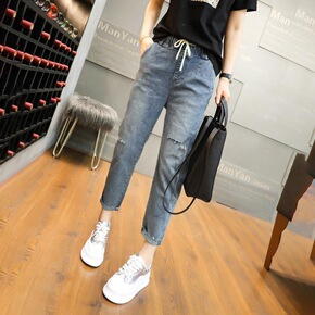 牛仔裤女2021新款大码九分破洞高弹力松紧腰老爹裤...