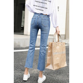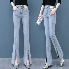 2022春季微喇牛仔九分裤女高腰弹力拼接开叉钉珠喇...