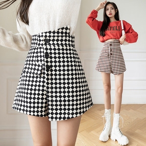 不规则毛呢格子半身裙秋冬女裤裙高腰短裙2021年新...