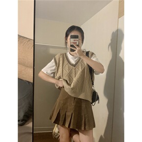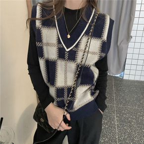 复古格子针织马甲女网红外穿韩版叠穿V领毛衣背心洋气...