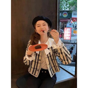 2021秋冬气质小香风圆领格纹拼接撞色单排扣开衫外...