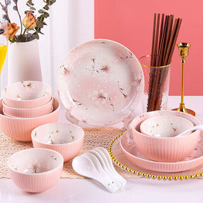 樱花釉下彩粉色陶瓷日式碗碟套装家用南瓜碗自由组合吃...