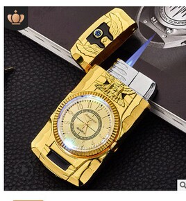 创意充气直冲打火机金属防风带七彩灯手表打火机礼品批...