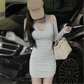 辣妹挂脖镂空露背性感吊带裙女欧美风不规则扭花紧身连...