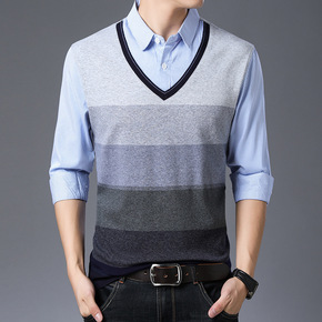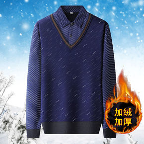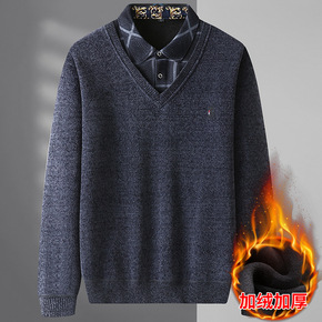 加绒加厚男士假两件衬衫领毛衣男中老年套头打底针织衫...