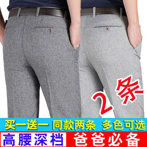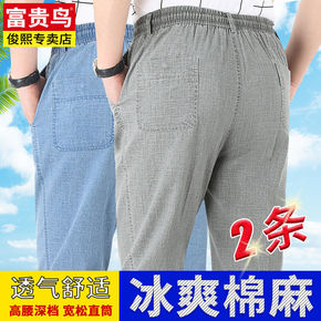 夏季薄款棉亚麻松紧腰中老年男裤中年男士休闲裤宽松直...