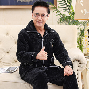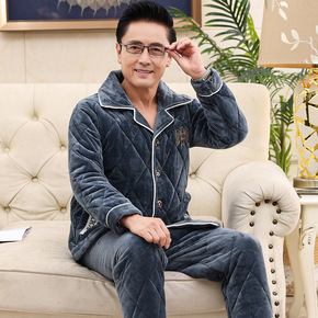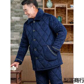 中老年睡衣男士冬季加绒加厚三层夹棉袄保暖爸爸珊瑚绒...