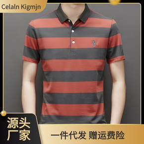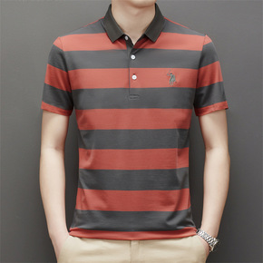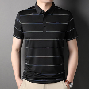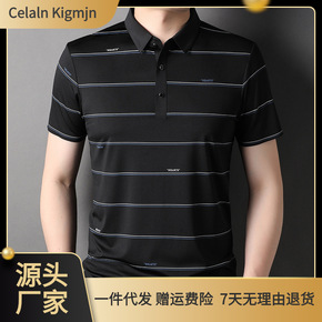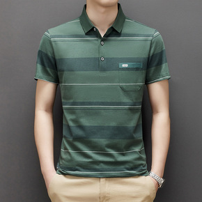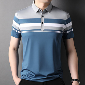 男士短袖t恤2022新款潮流冰爽中年翻领条纹半袖爸...