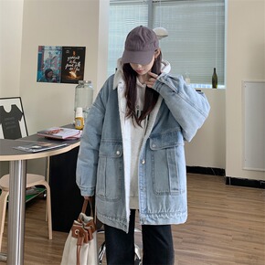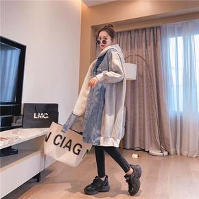 盐系炸街连帽牛仔仿羊羔毛外套女秋冬韩版中长款休闲工...