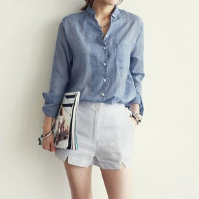 棉麻衬衫女2021春季新款韩版纯色POLO领长袖百...
